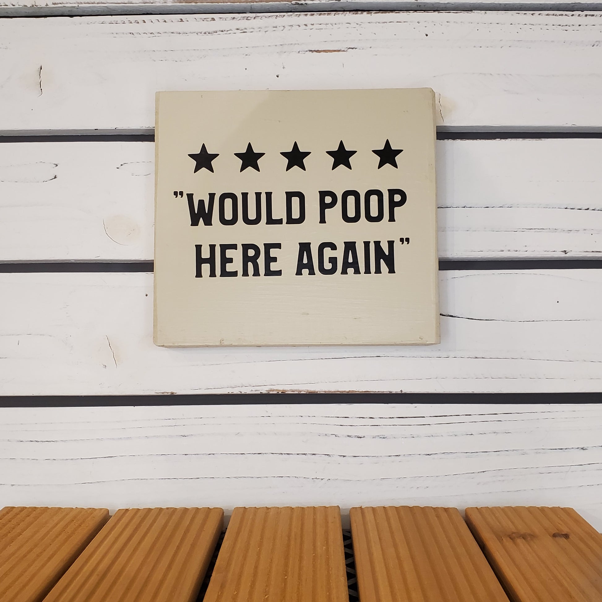 "Would Poop Here Again” 6x6 White Wooden Sign