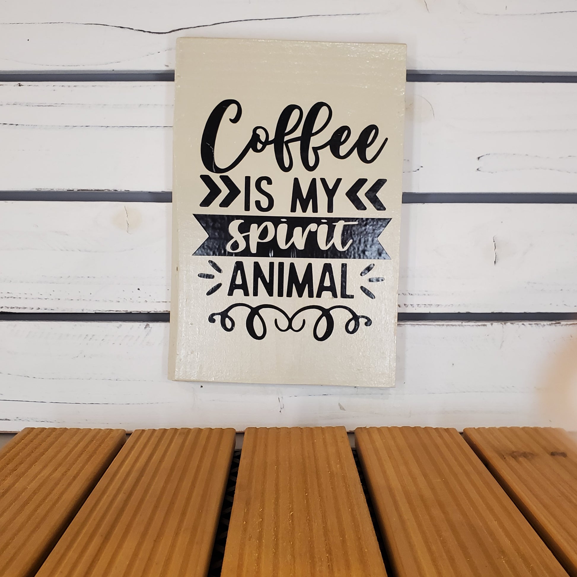 Show off your sense of humor with our “Coffee Is My Spirit Animal” 6x8 Wooden Sign. With its rustic white finish, bold black lettering, and fun filigree accents, this playful piece adds personality and charm to any kitchen, coffee nook, or living space. Perfect for a shelf, countertop, or wall, it brings a whimsical and relatable touch that coffee lovers and guests can’t help but notice.