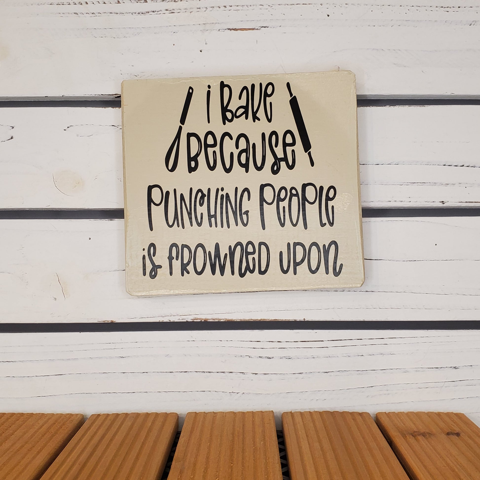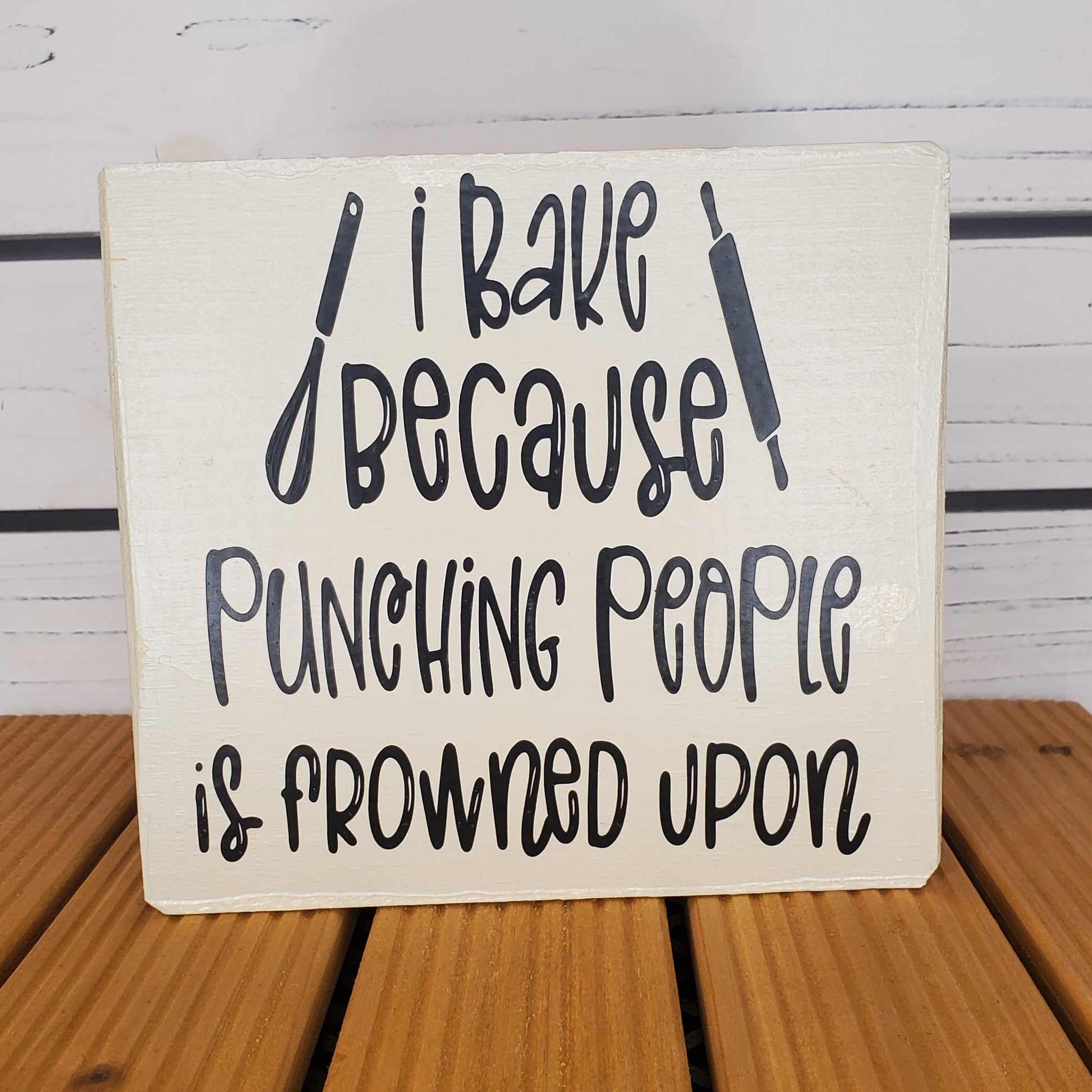 “I Bake Because Punching People Is Frowned Upon” 6x6 White Wooden Sign