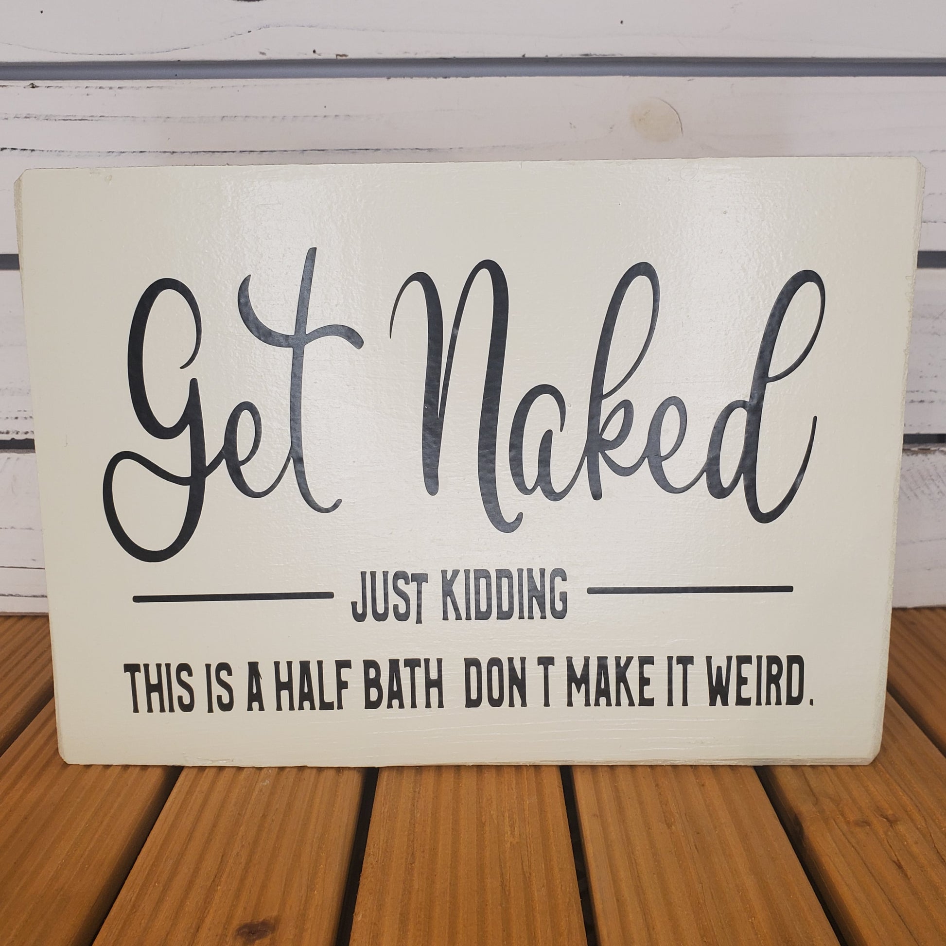 Show off your sense of humor with our “Get Naked… Just Kidding, This Is a Half Bath, Don’t Make It Weird” 8x10 White Wooden Sign. With its rustic white finish, bold black lettering, and perfectly playful message, this witty décor piece adds instant personality to any bathroom or powder room. Perfect for a shelf, countertop, or wall, it brings a fun touch that guests can’t help but laugh at.