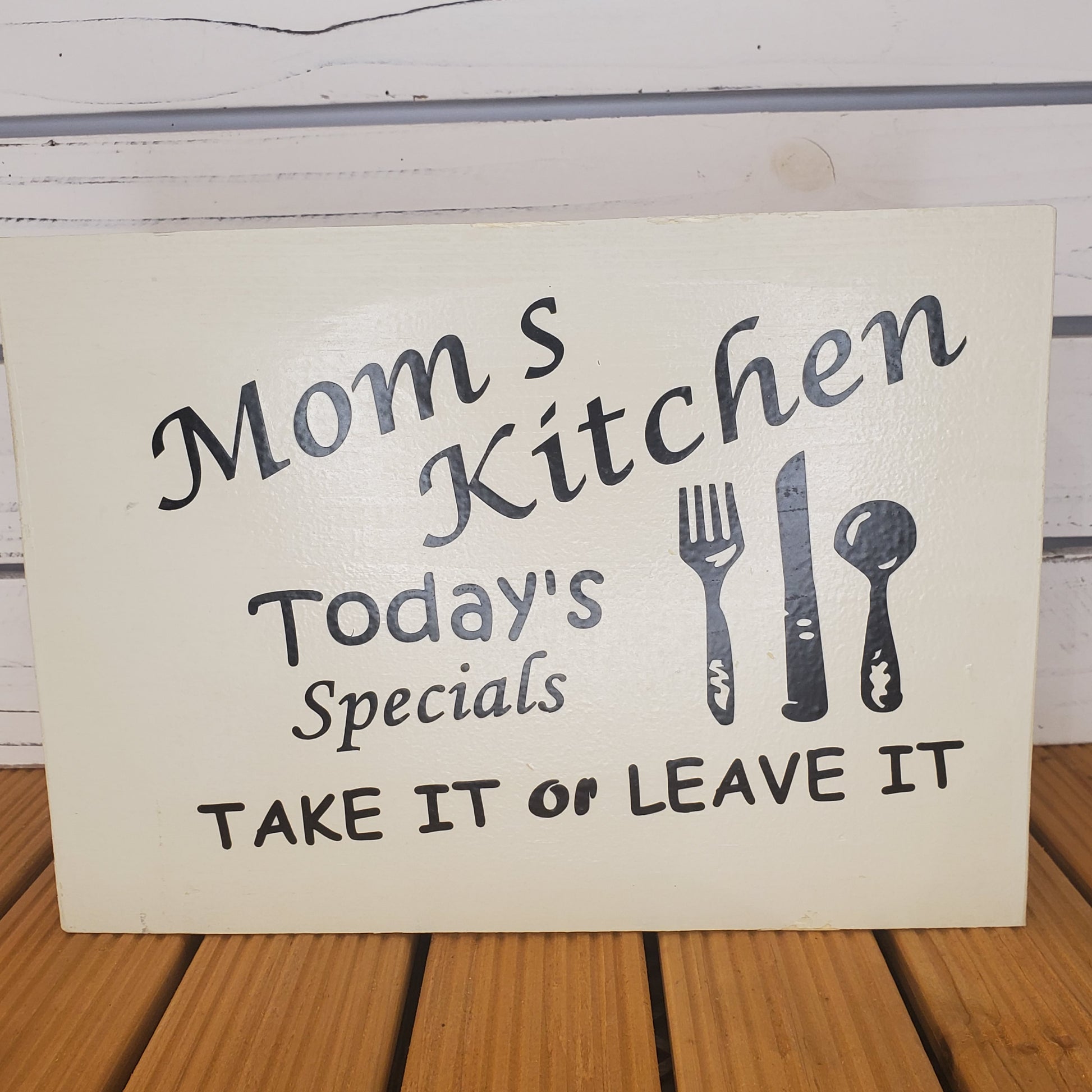 Show off your sense of humor with our “Moms Kitchen: Today’s Specials—Take It or Leave It” 8x10 white wooden sign. With its rustic white finish, bold black lettering, and charming cutlery graphic, this playful piece adds personality and warmth to any kitchen or dining space. Perfect for a countertop, shelf, or wall, it brings a fun touch that family and guests can’t help but smile at.