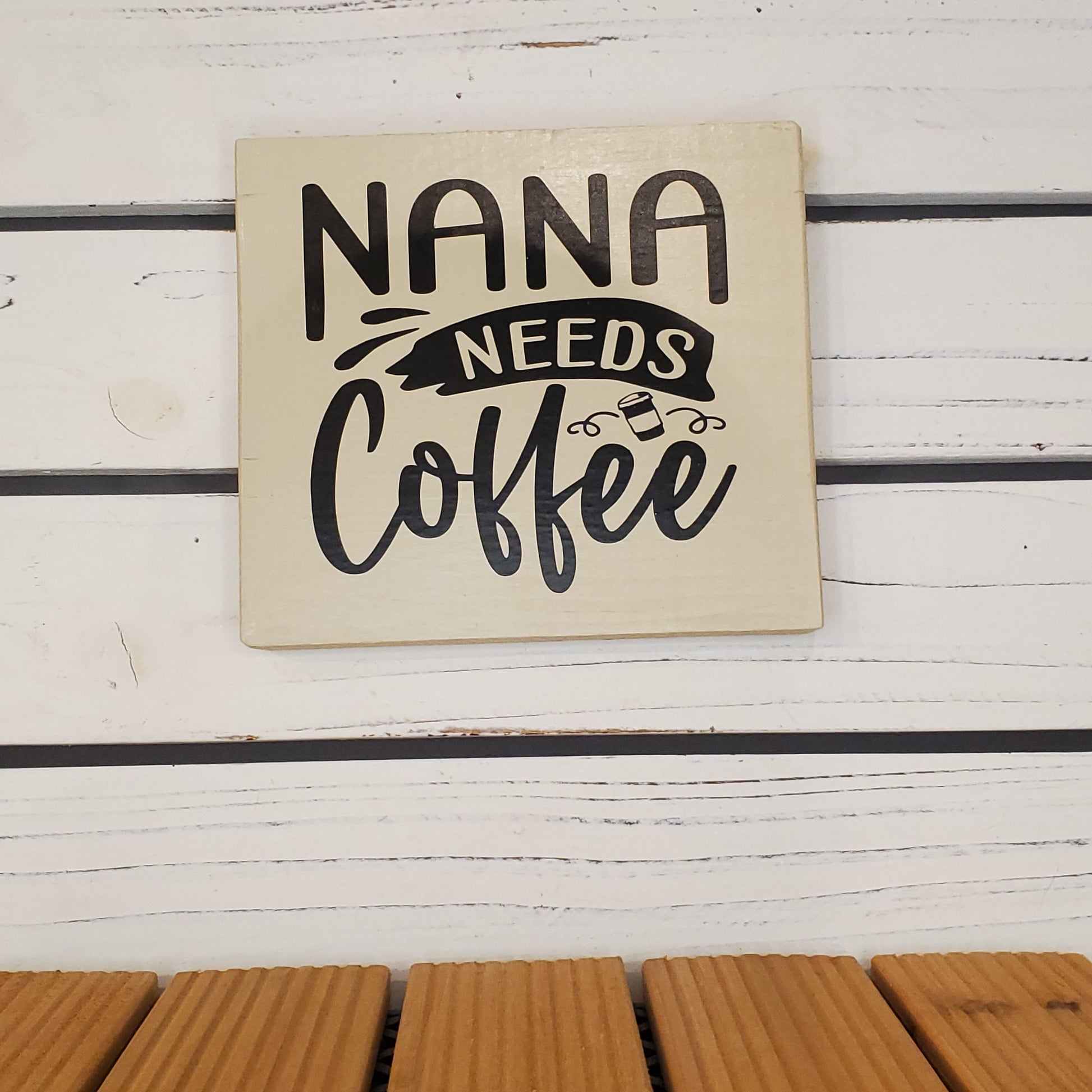 “Nana Needs Coffee” 6x6 White Wooden Sign