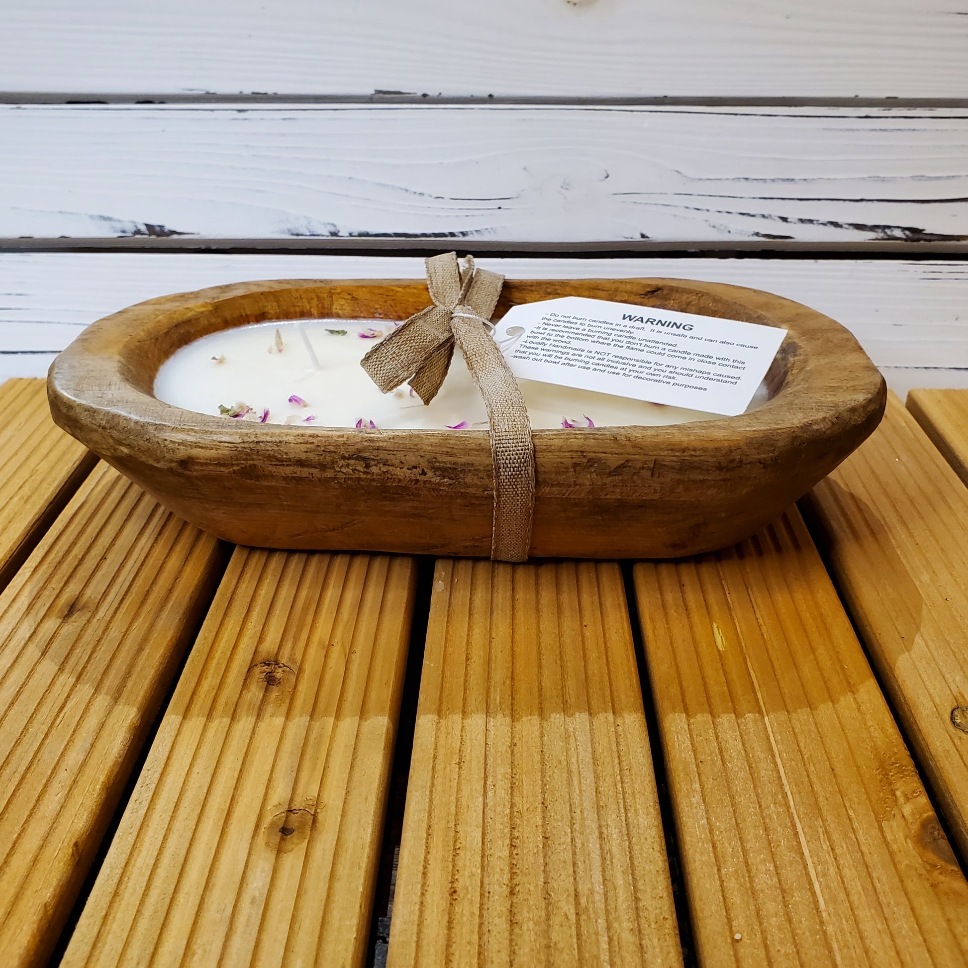 Soy Wax Wooden Dough Bowl with Dried Flowers brings a soft, natural glow to your space with its hand-poured soy wax nestled inside a beautifully carved wooden bowl. Infused with a delicate blend of wisteria and lilac, subtle dried floral accents float gently on the surface, creating a calm, organic aesthetic that complements farmhouse, rustic, and minimalist décor.